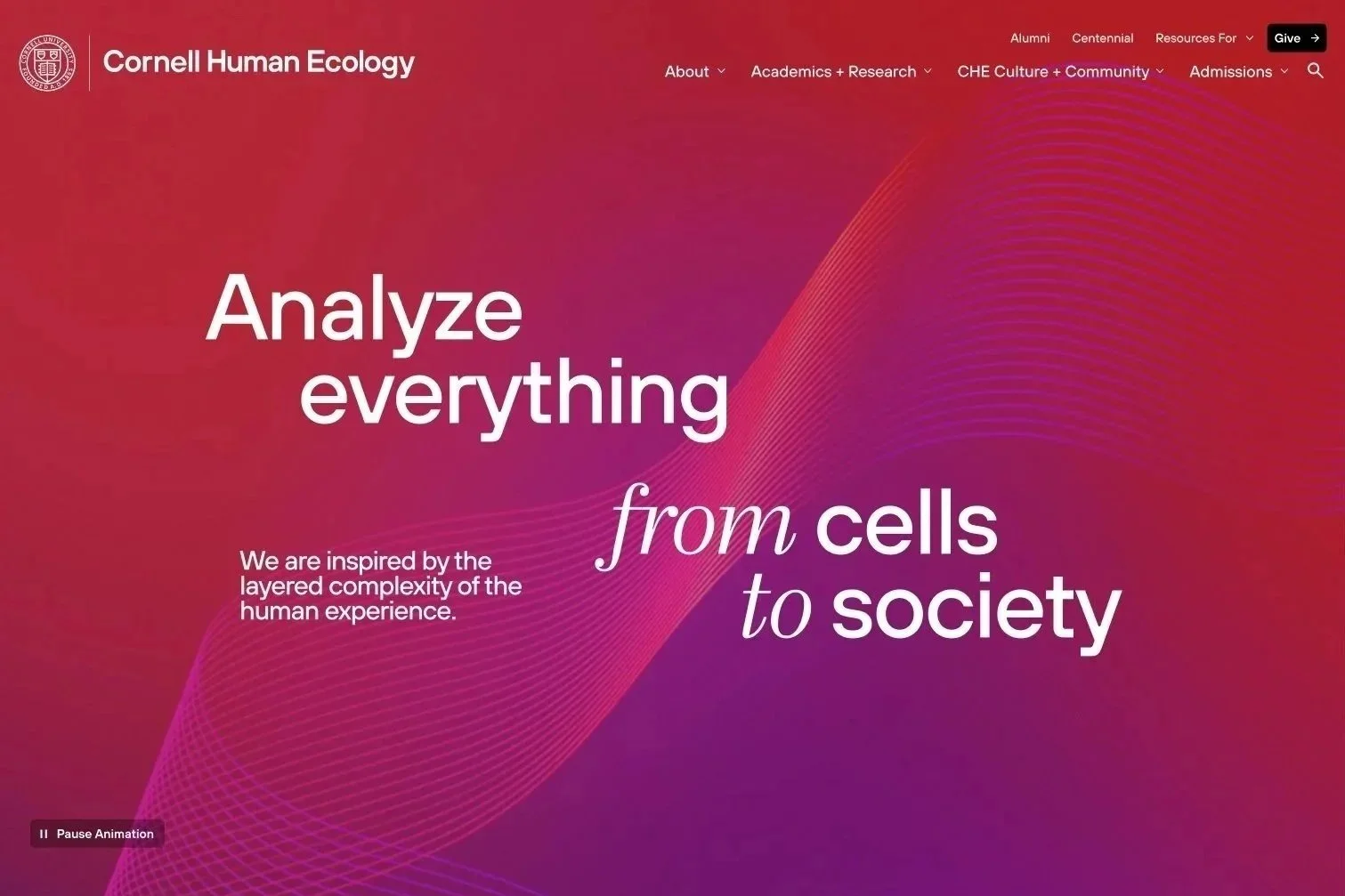 Cornell College of Human Ecology (CHE) left audiences struggling to understand what human ecology is and why it matters. The new digital experience needed to unify programs and outcomes under a single vision, showing how the College pushes humanity forward while supplying each person with a sense of purpose and possibility.
